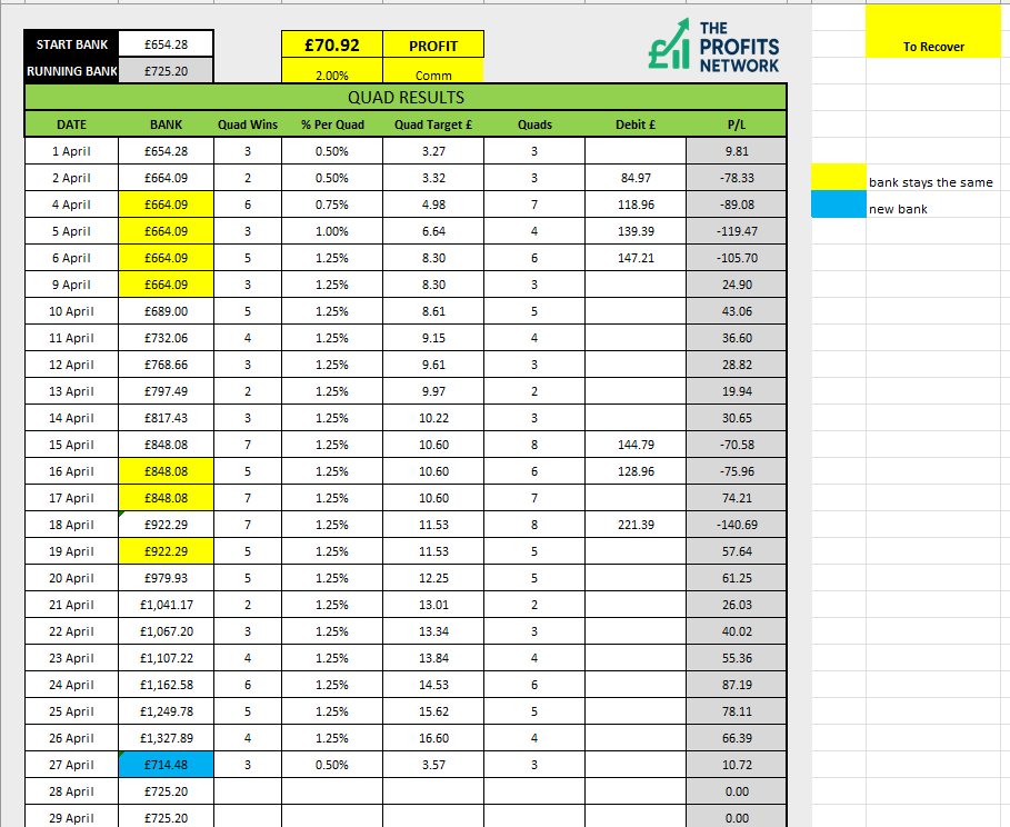 To get the new bank we add the bank from the 23rd (£133.58) + any debits (-£11.22 in this case) + any profit made (£2.72, £2.98, £2.99 & £3.12 in this case) to get the next bank of £134.16 (note it should always be higher than the bank on that debit day.