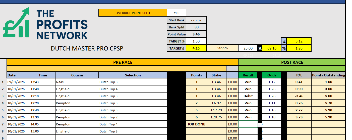 When you open it click enable edit, change the bank to what you want, change the bank split to 80 which will change the stake. At the moment if you paste the selection it will say something like 4#2025-09-03 14:05#Lingfield the important part is the first number before the hash (in this case its 4#) this means Dutch Top 4 or 3#2025-09-03 14:35#Lingfield means 3# Dutch Top 3. Dave was working on the syntax code to change it.