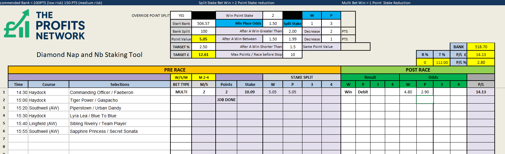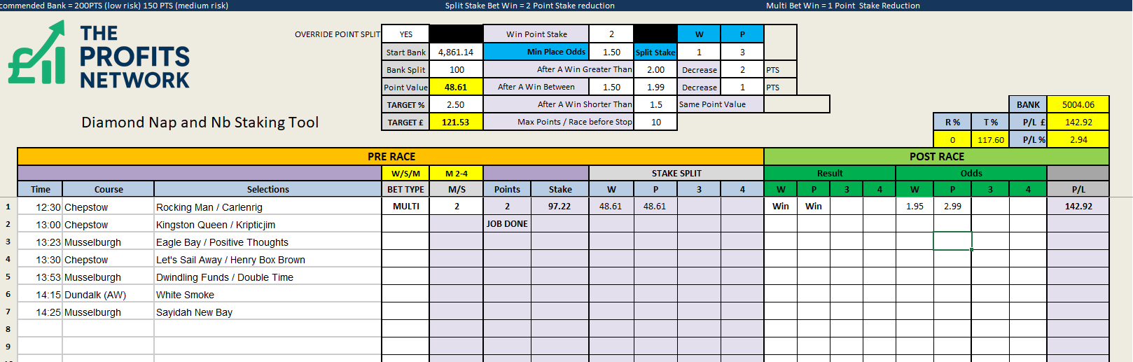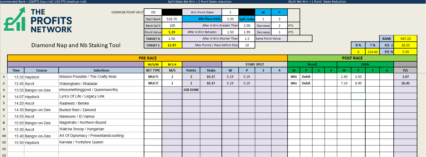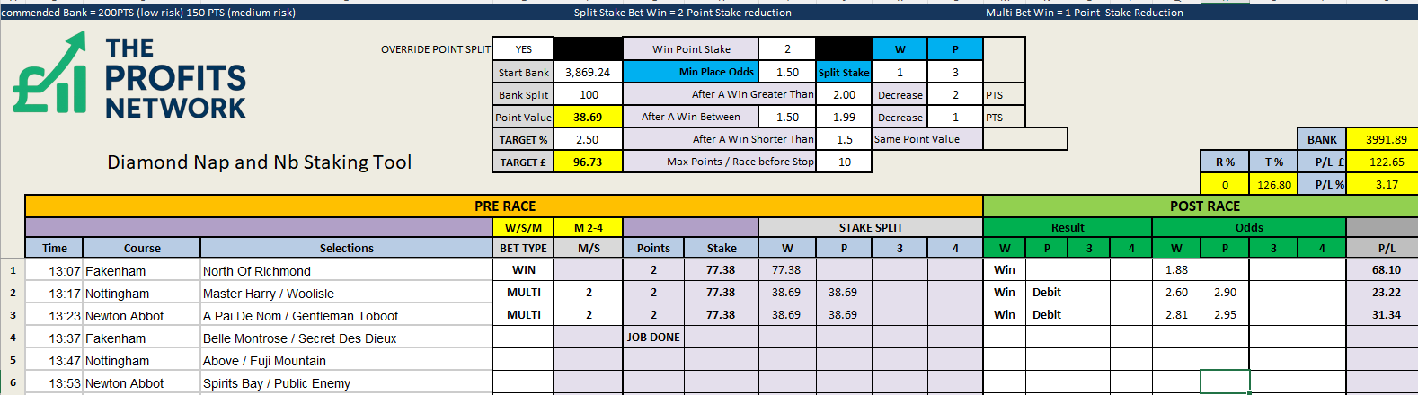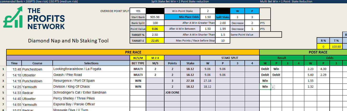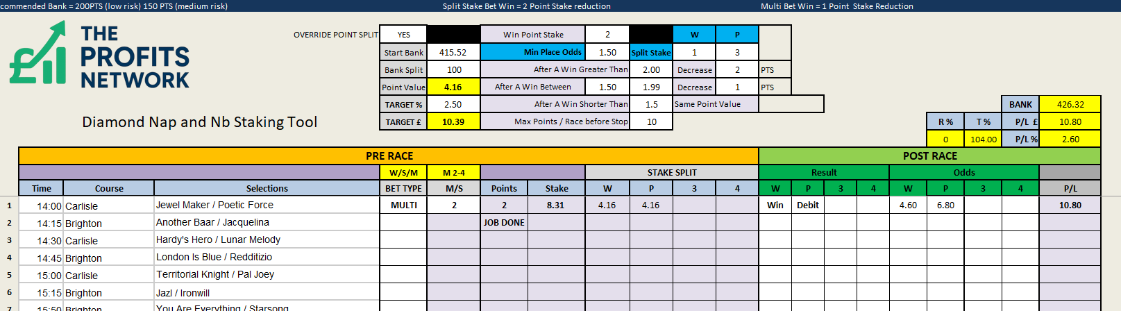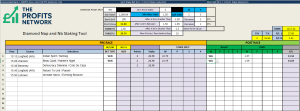 Alastair, I meant to say earlier, if you only wanted to play the NAP in each race, you can still use the same staking sheet. The bet would be played to the first set of guidelines in the Rules of Engagement. Any questions let me know.