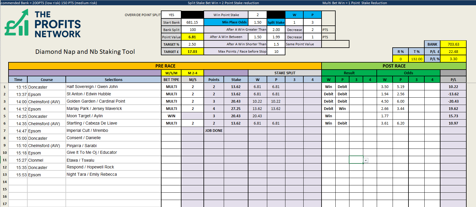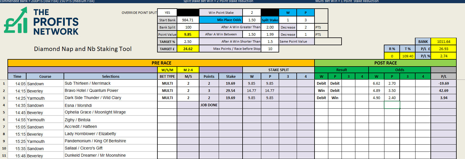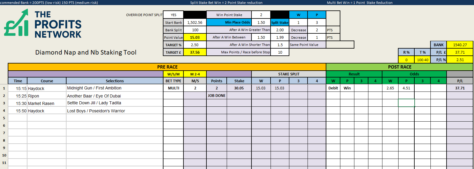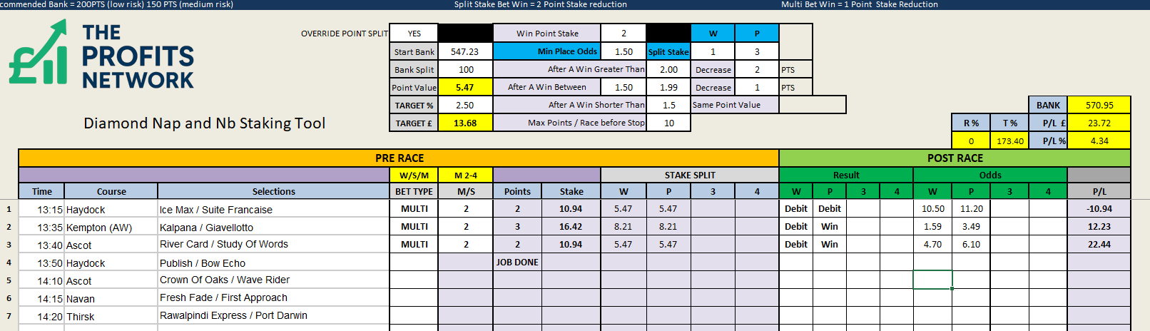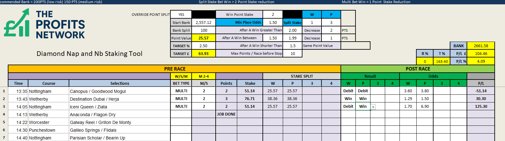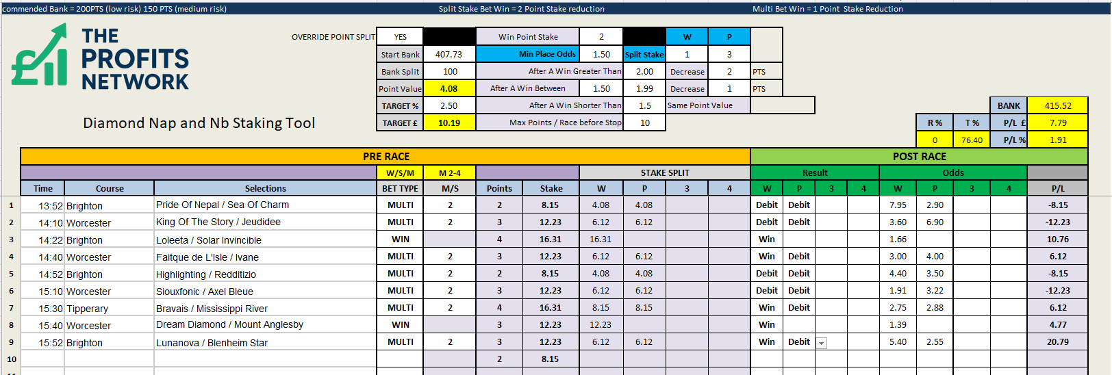Alastair, I meant to say earlier, if you only wanted to play the NAP in each race, you can still use the same staking sheet. The bet would be played to the first set of guidelines in the Rules of Engagement. Any questions let me know.