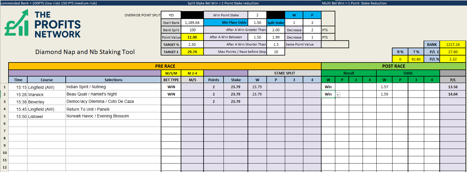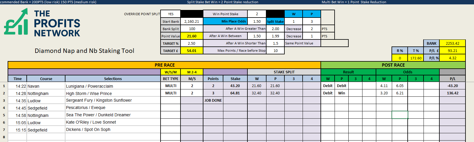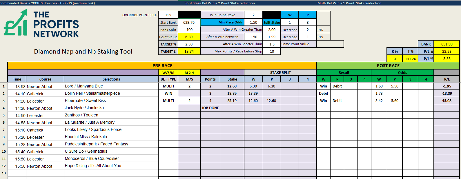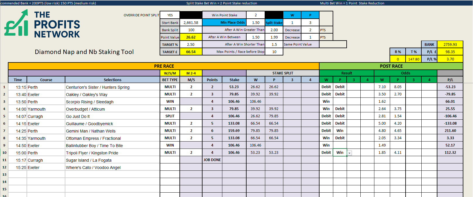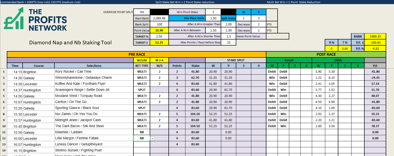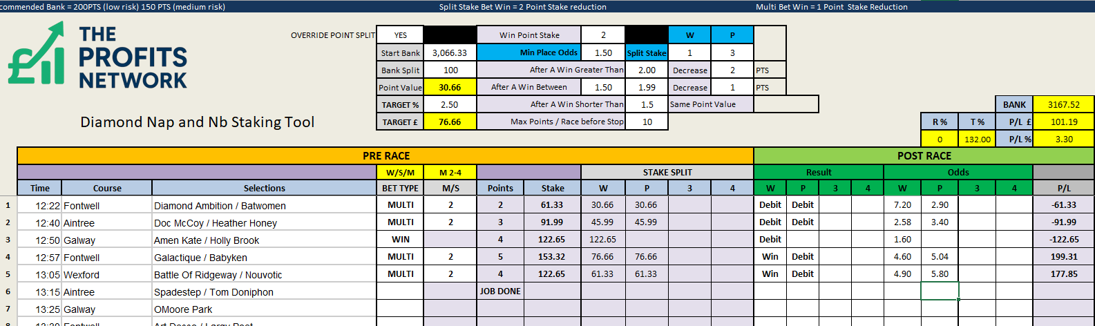 Alastair, I meant to say earlier, if you only wanted to play the NAP in each race, you can still use the same staking sheet. The bet would be played to the first set of guidelines in the Rules of Engagement. Any questions let me know.