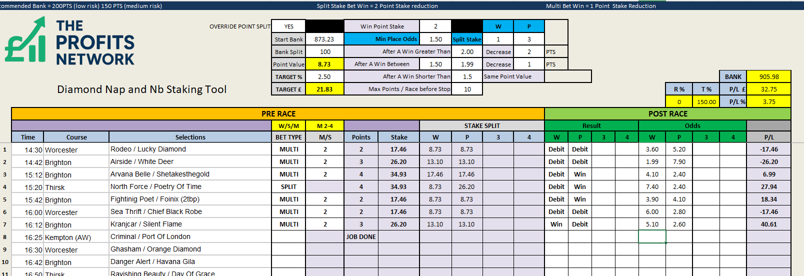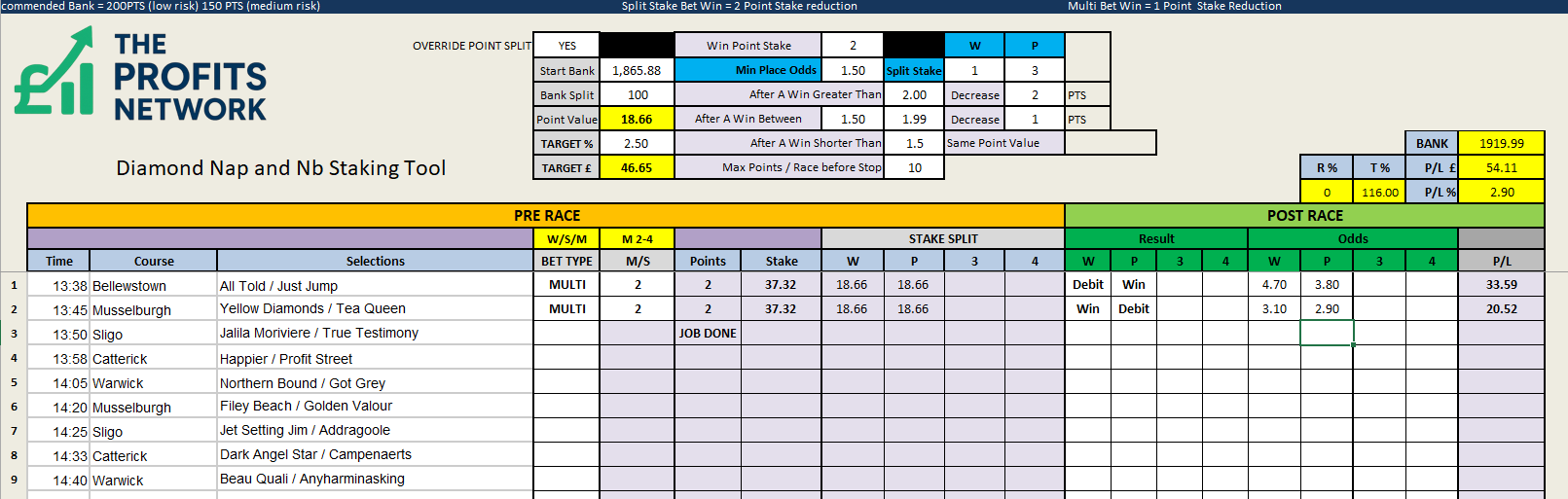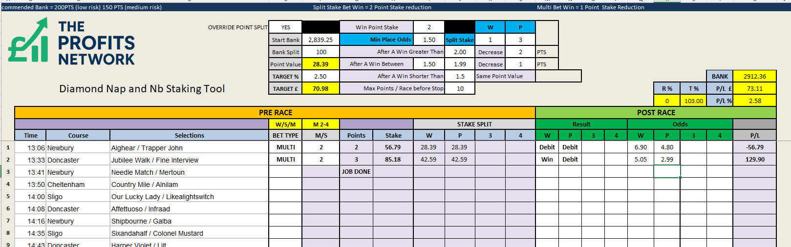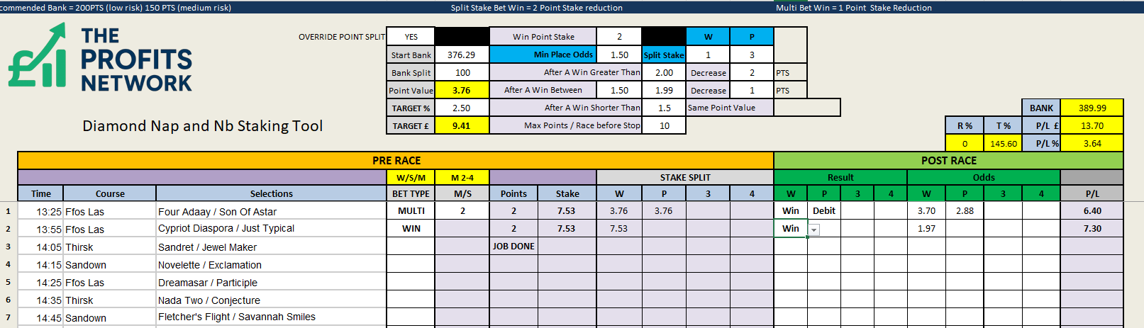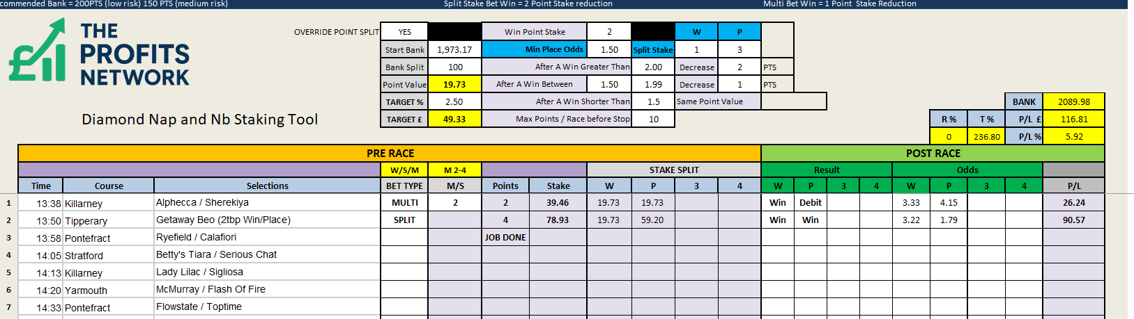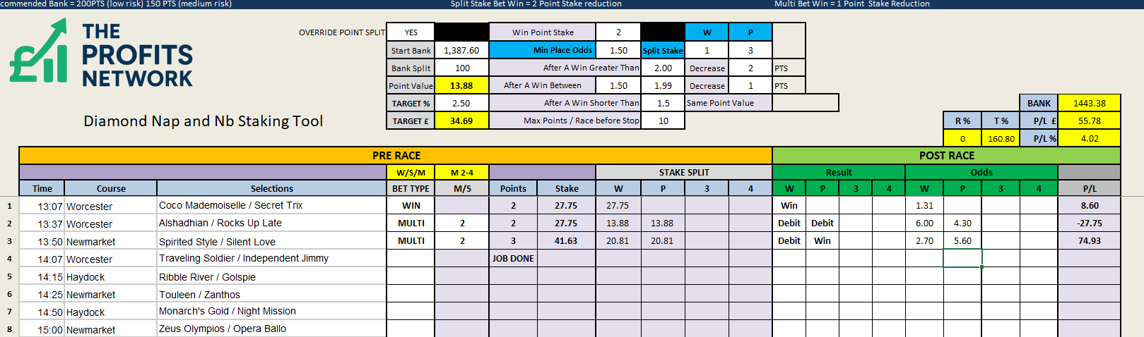 Alastair, I meant to say earlier, if you only wanted to play the NAP in each race, you can still use the same staking sheet. The bet would be played to the first set of guidelines in the Rules of Engagement. Any questions let me know.