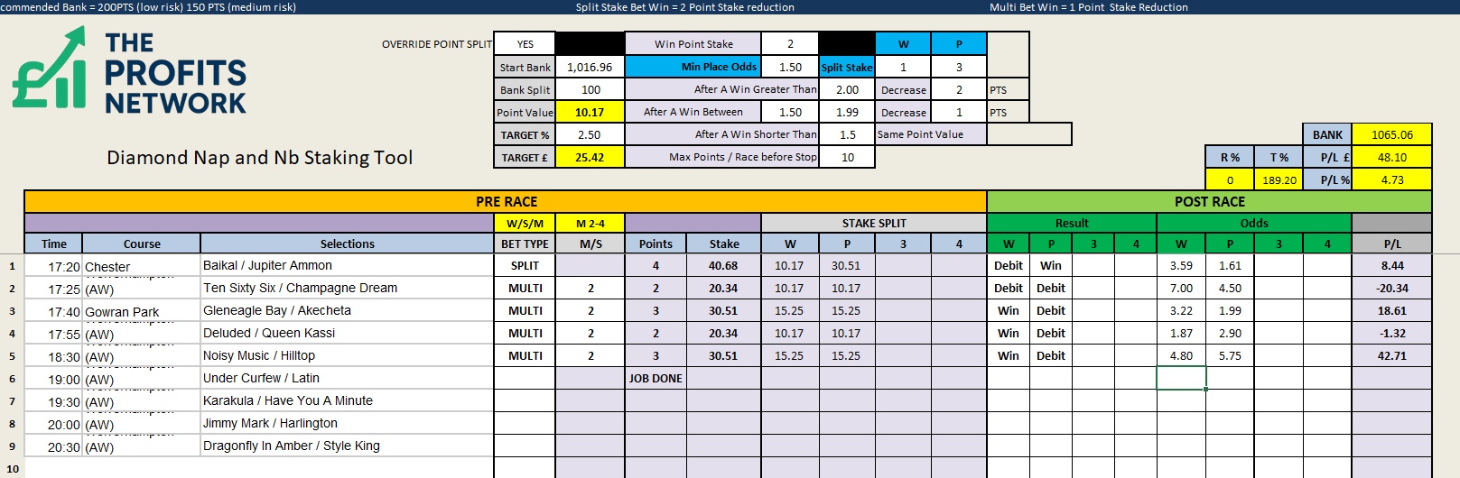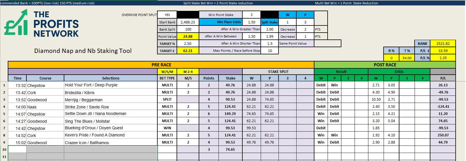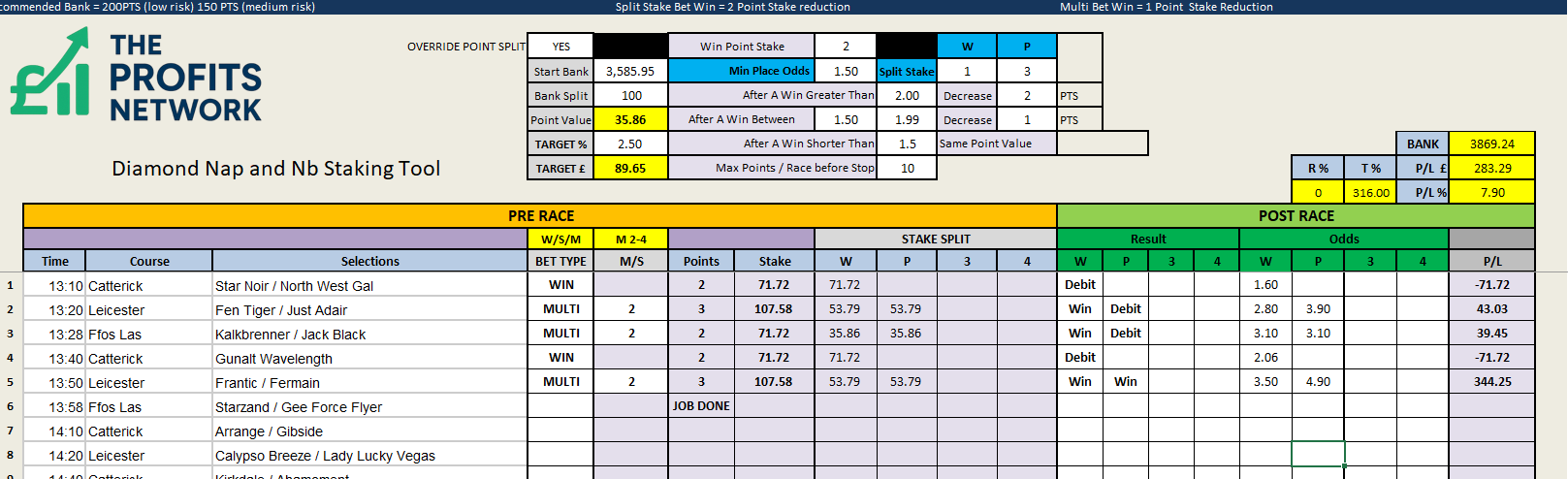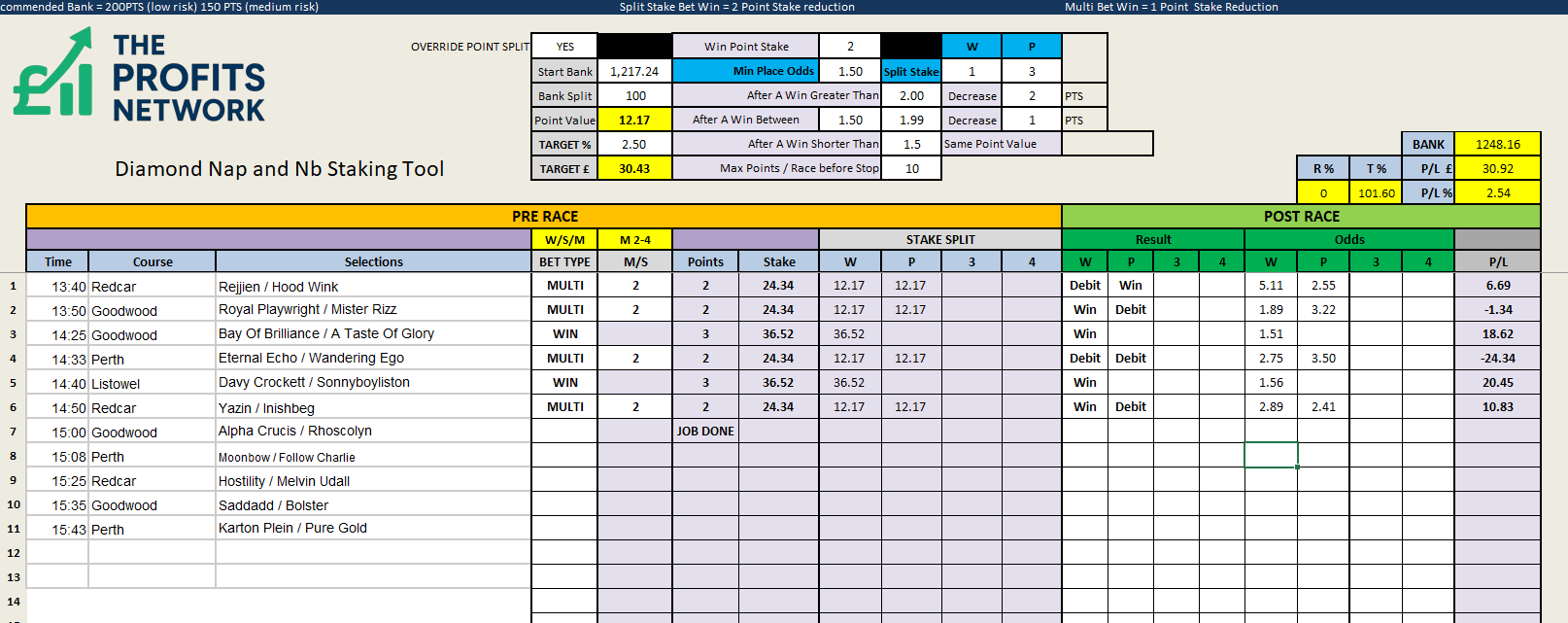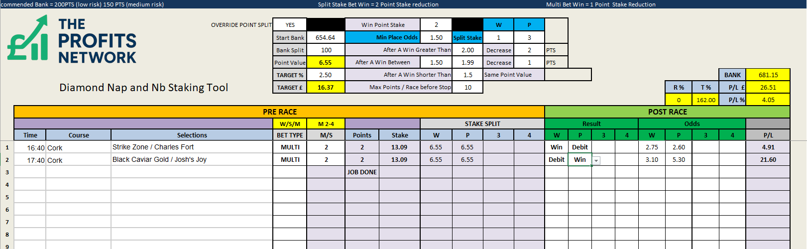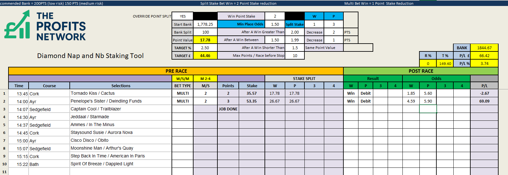 Alastair, I meant to say earlier, if you only wanted to play the NAP in each race, you can still use the same staking sheet. The bet would be played to the first set of guidelines in the Rules of Engagement. Any questions let me know.