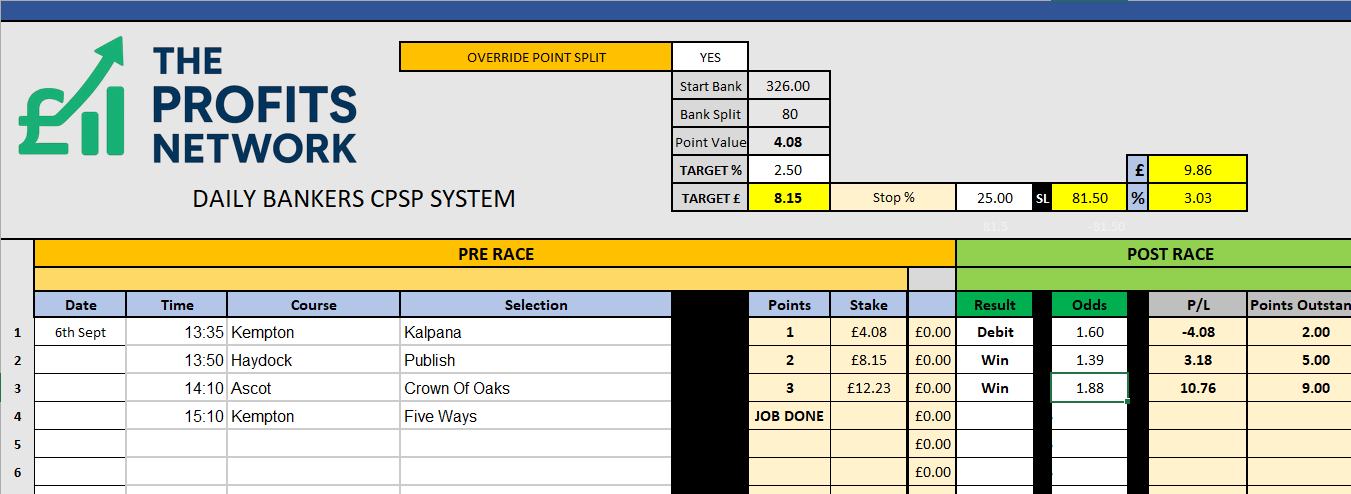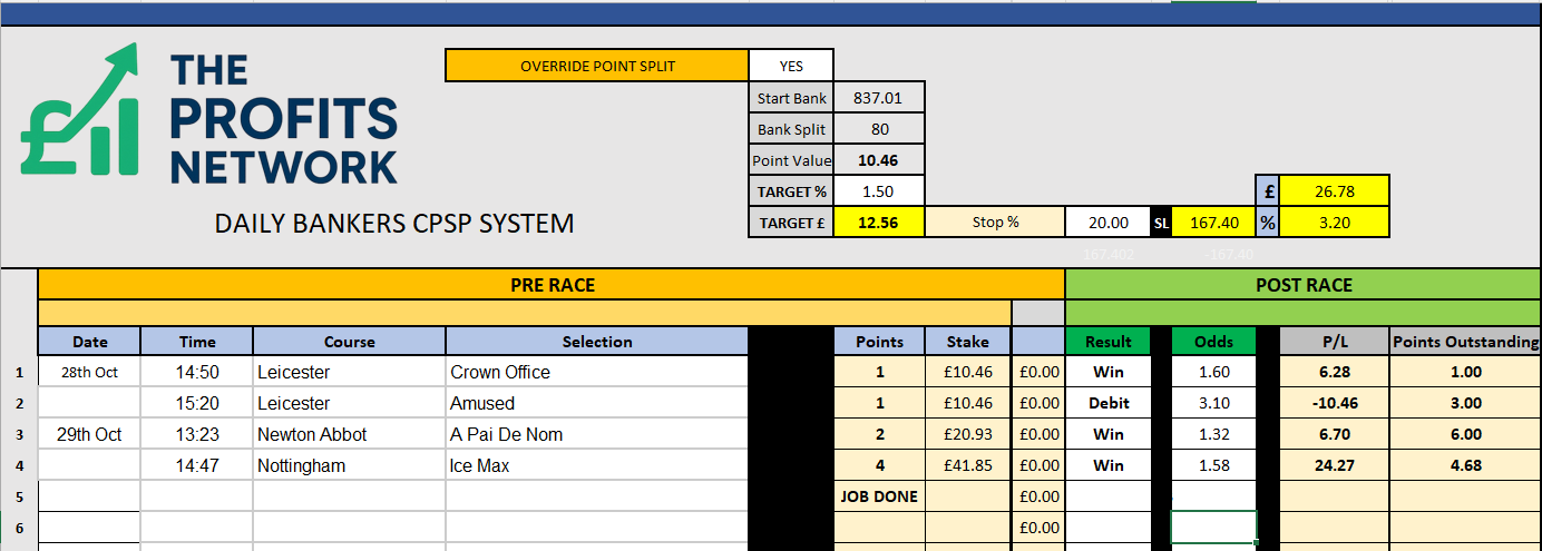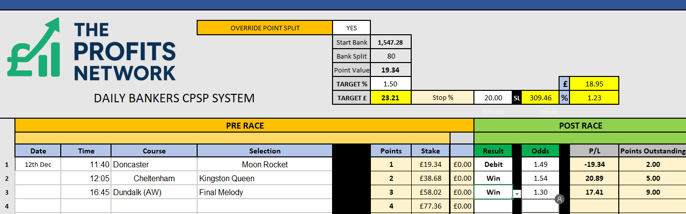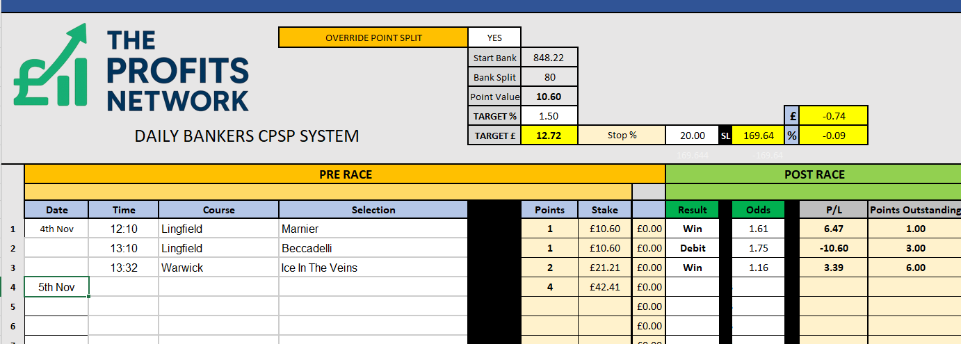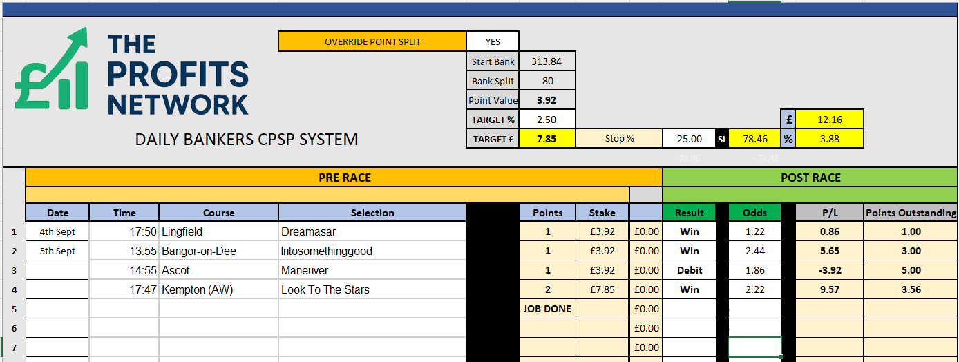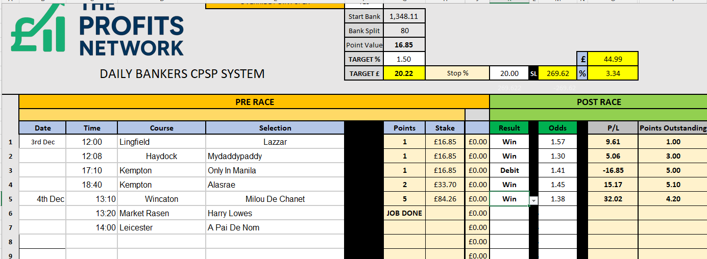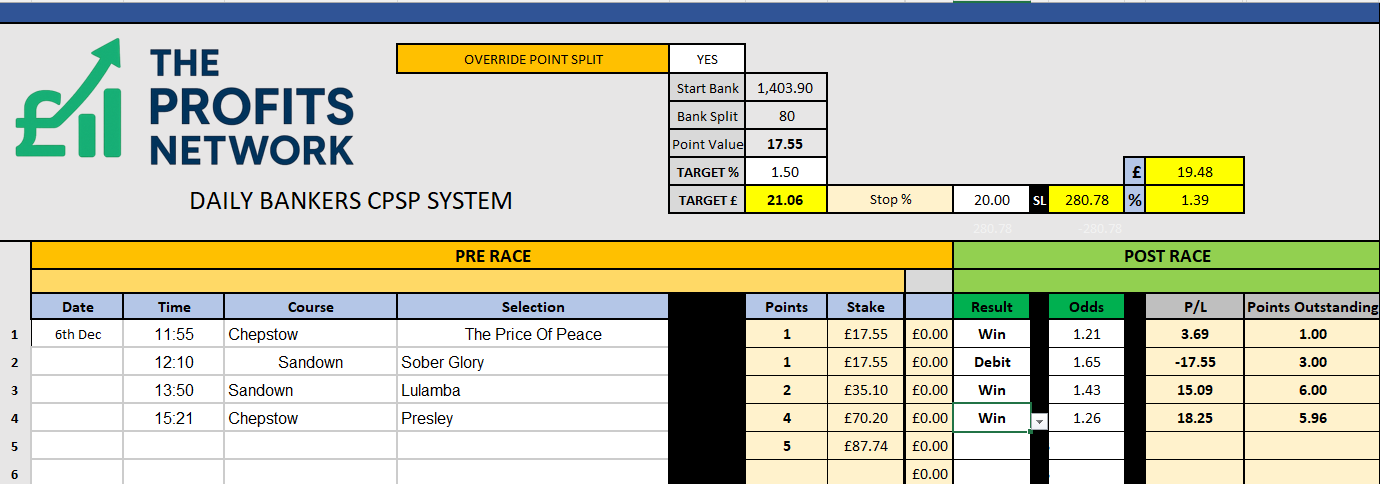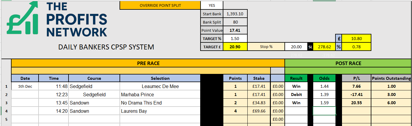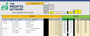 I didn’t work the 4th bet today as no 3tbp market available on Betdaq, with only 1.15 being needed for a target. Thought the 1.7 on 2tbp was too risky with the increased CPSP stake.