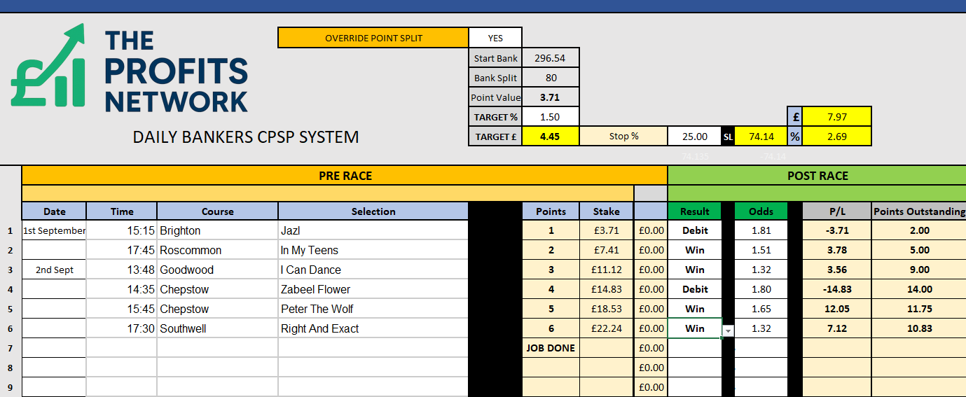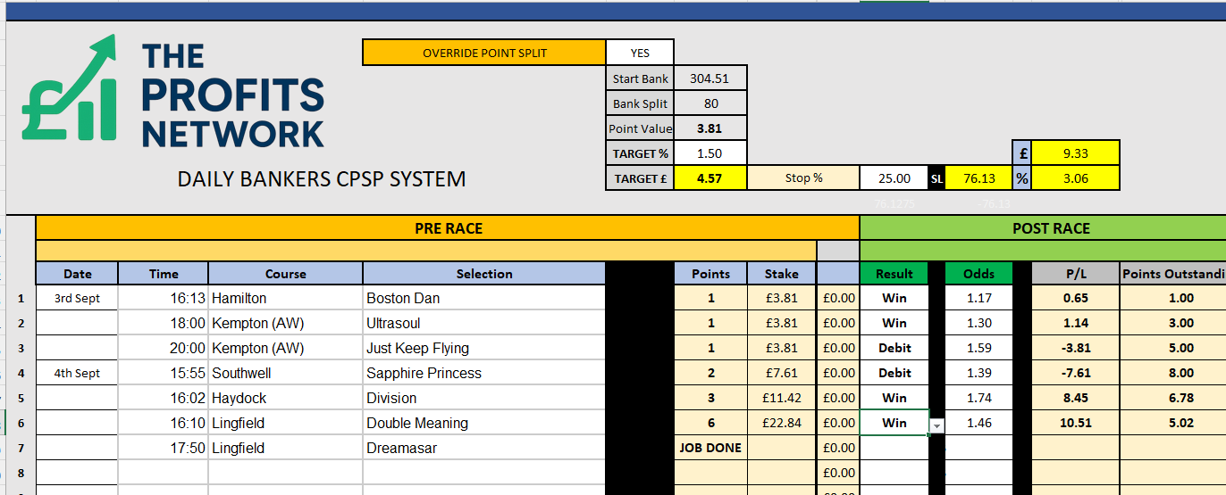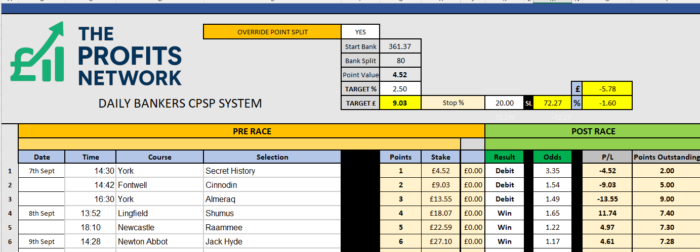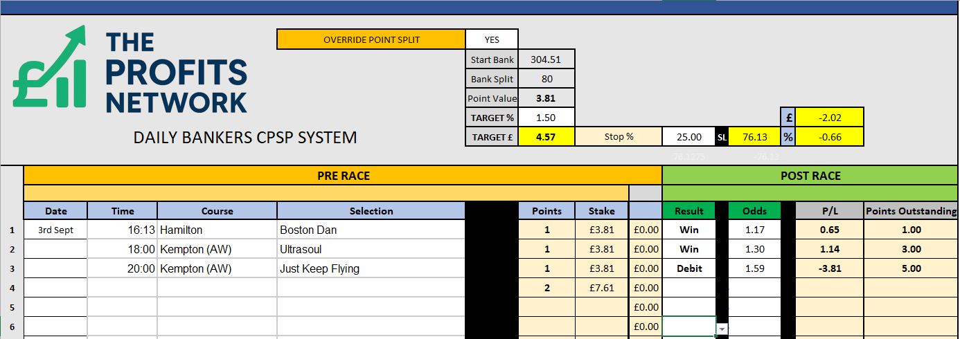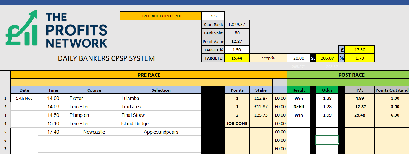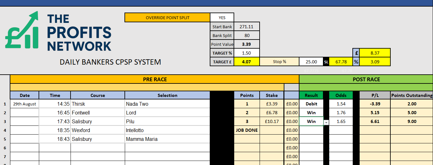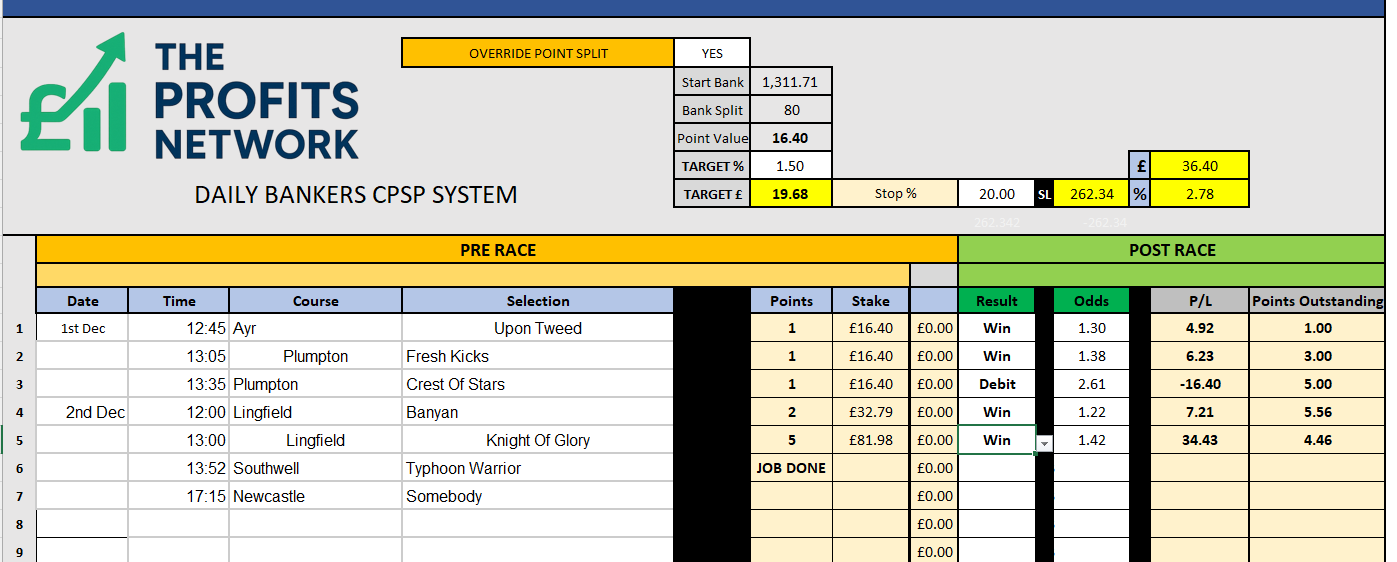 I didn’t work the 4th bet today as no 3tbp market available on Betdaq, with only 1.15 being needed for a target. Thought the 1.7 on 2tbp was too risky with the increased CPSP stake.