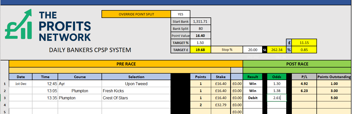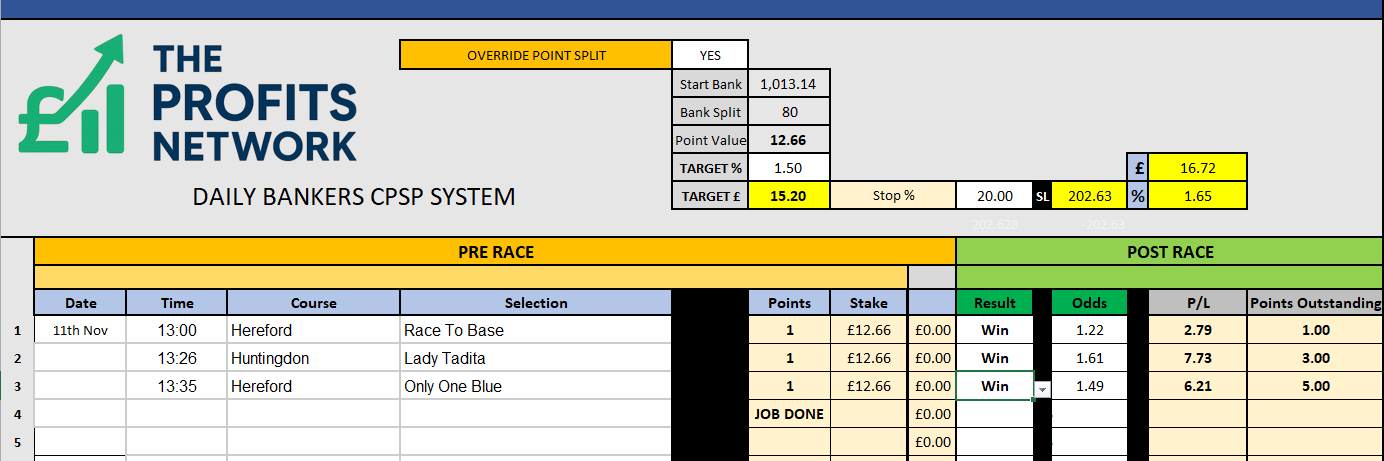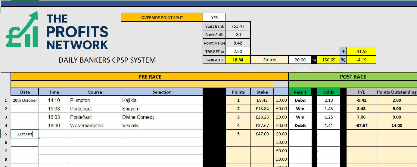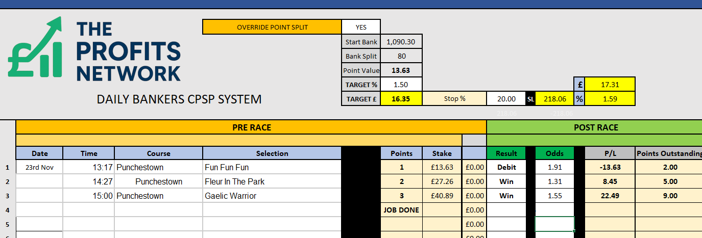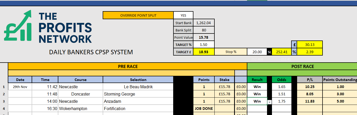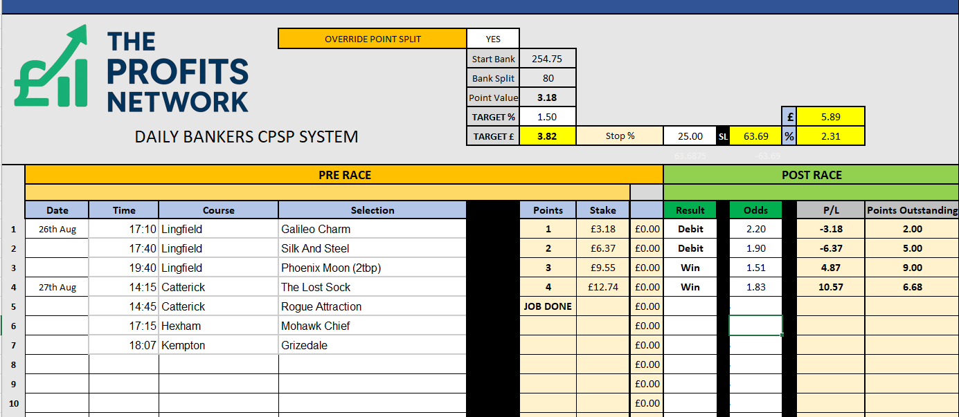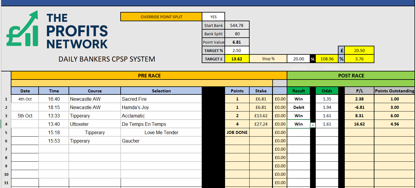 I didn’t work the 4th bet today as no 3tbp market available on Betdaq, with only 1.15 being needed for a target. Thought the 1.7 on 2tbp was too risky with the increased CPSP stake.