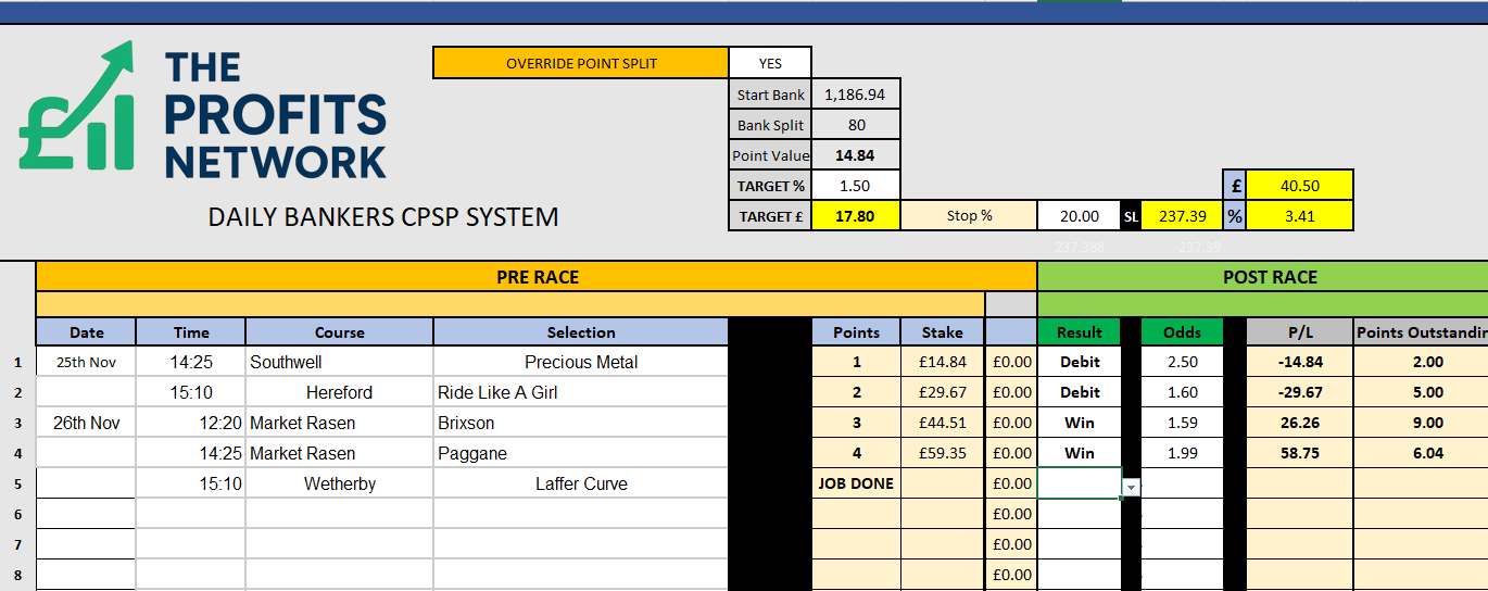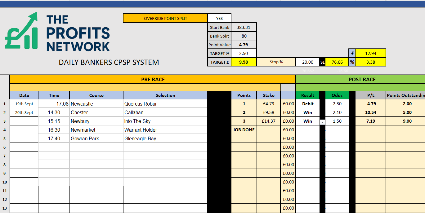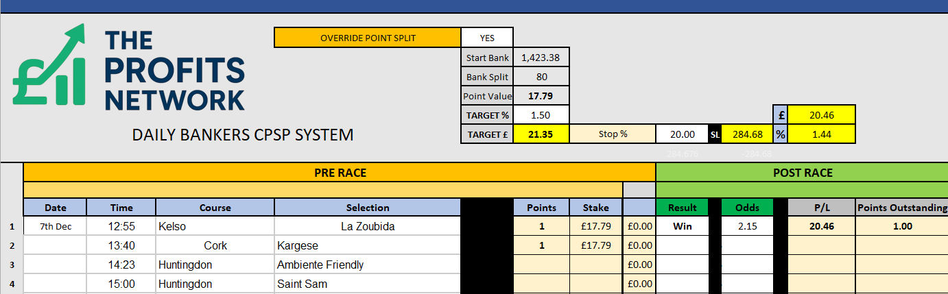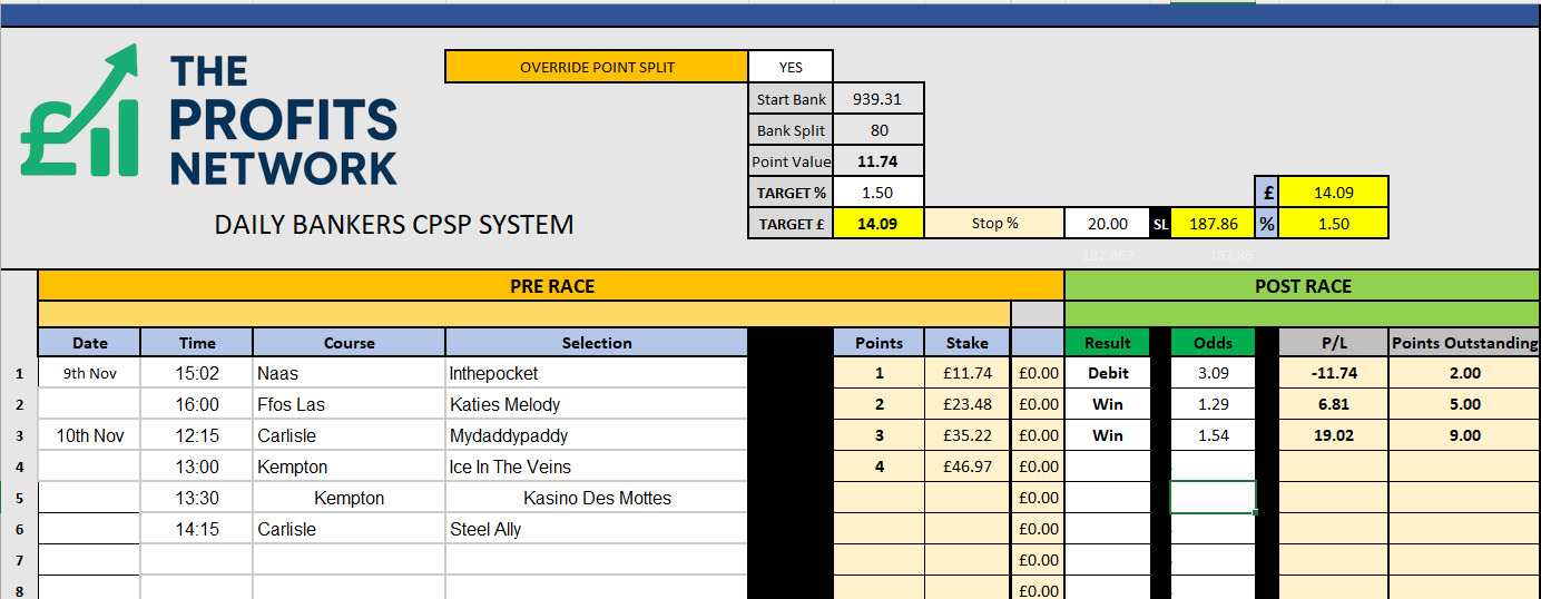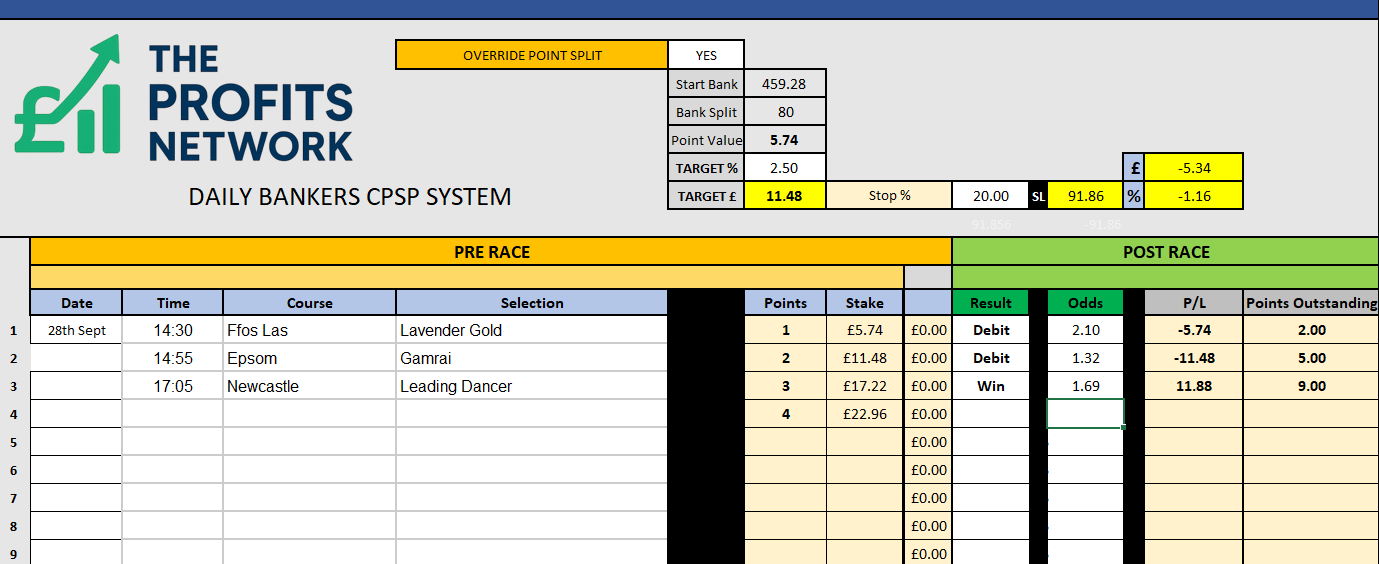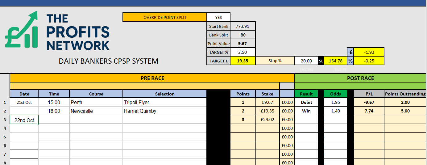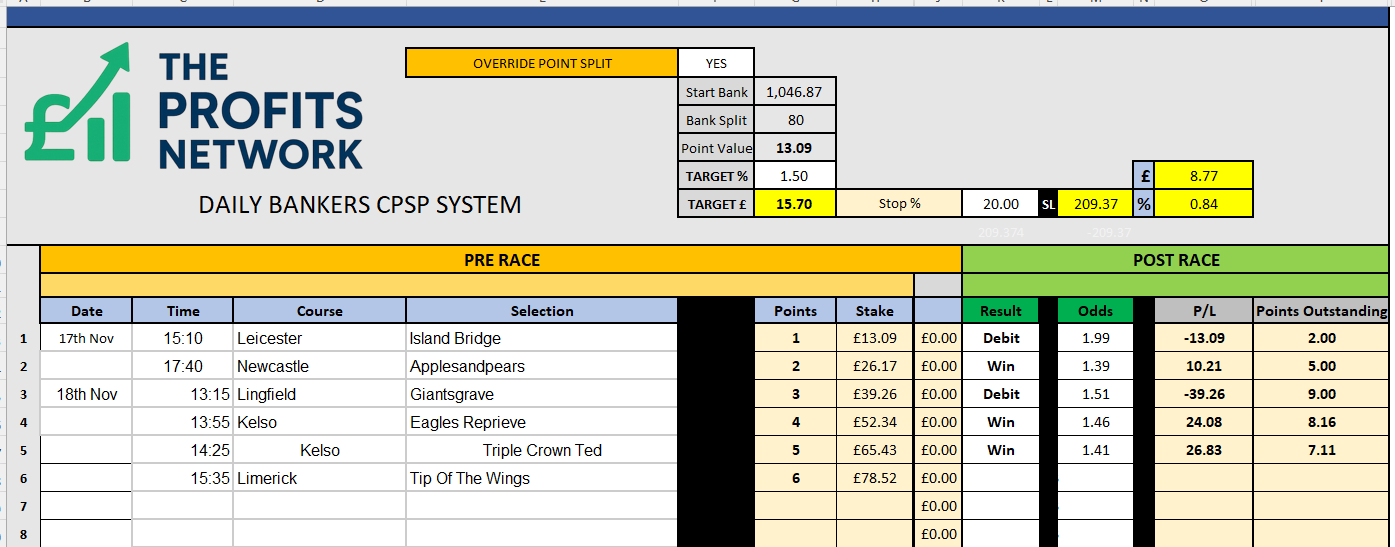 I didn’t work the 4th bet today as no 3tbp market available on Betdaq, with only 1.15 being needed for a target. Thought the 1.7 on 2tbp was too risky with the increased CPSP stake.