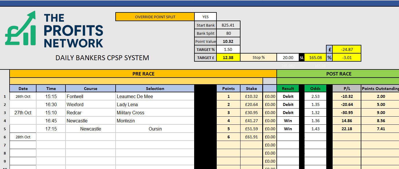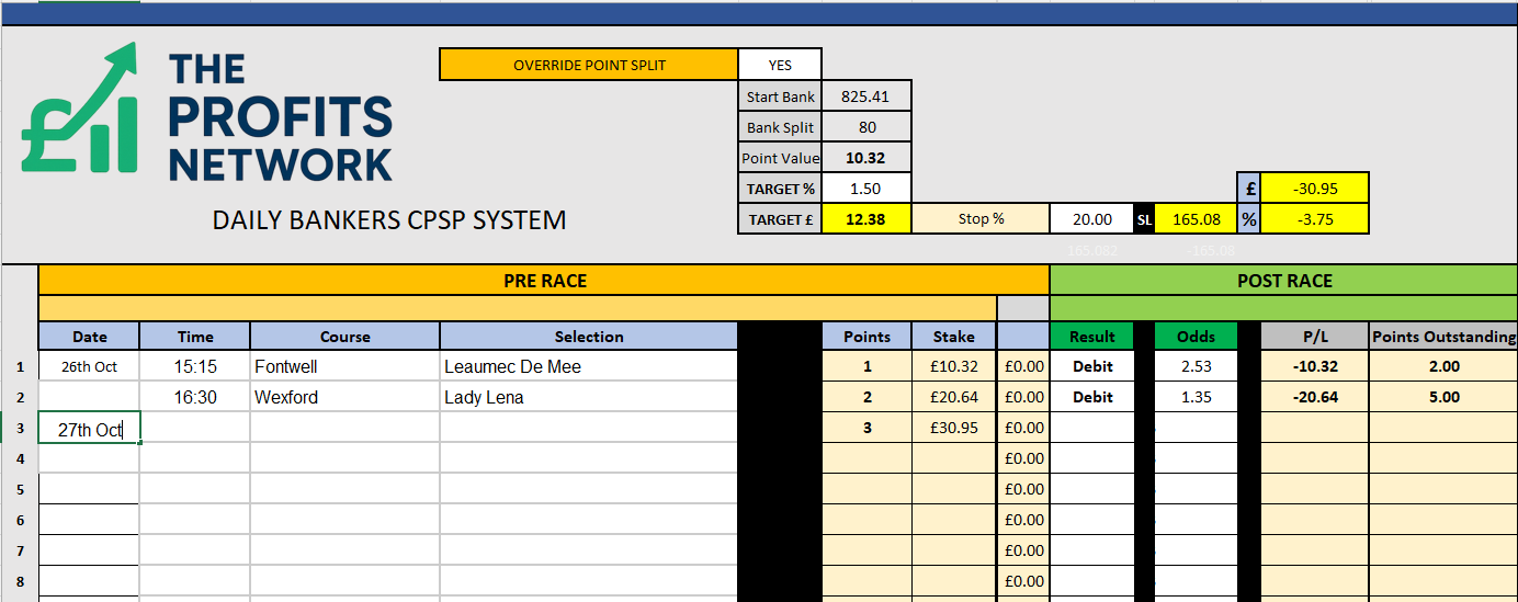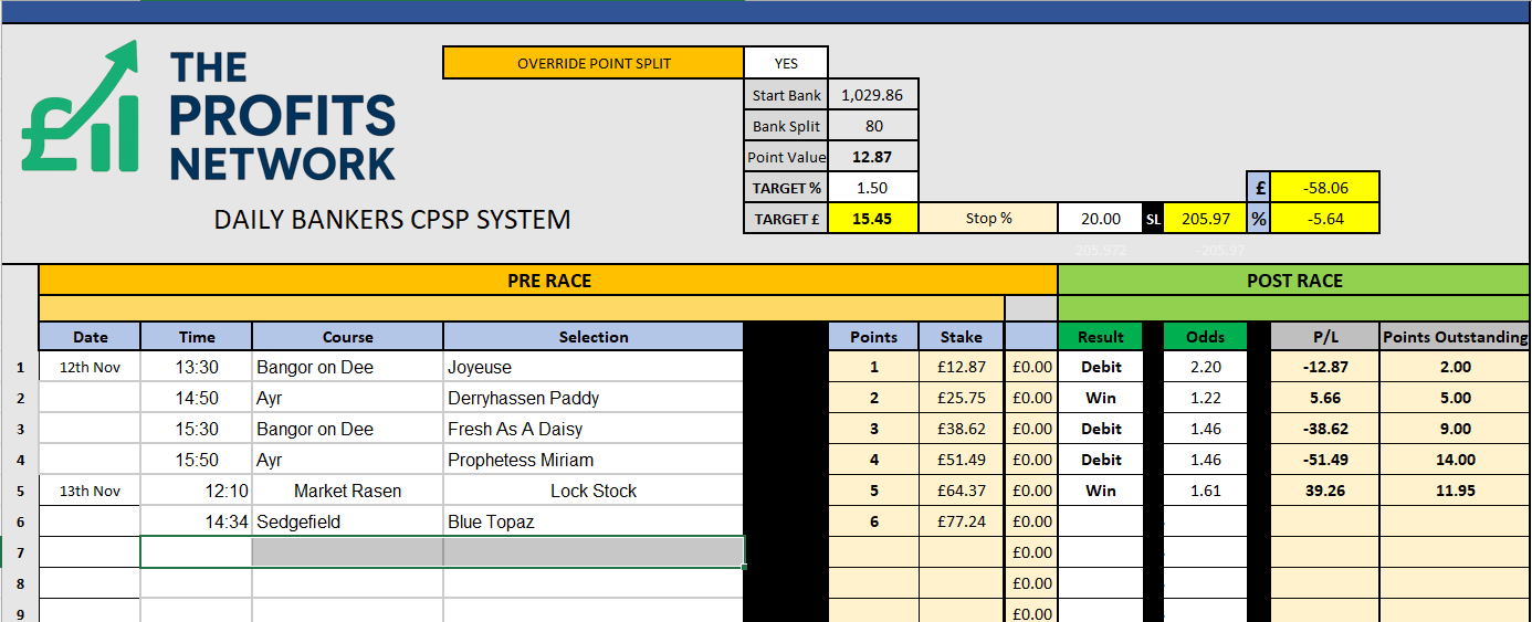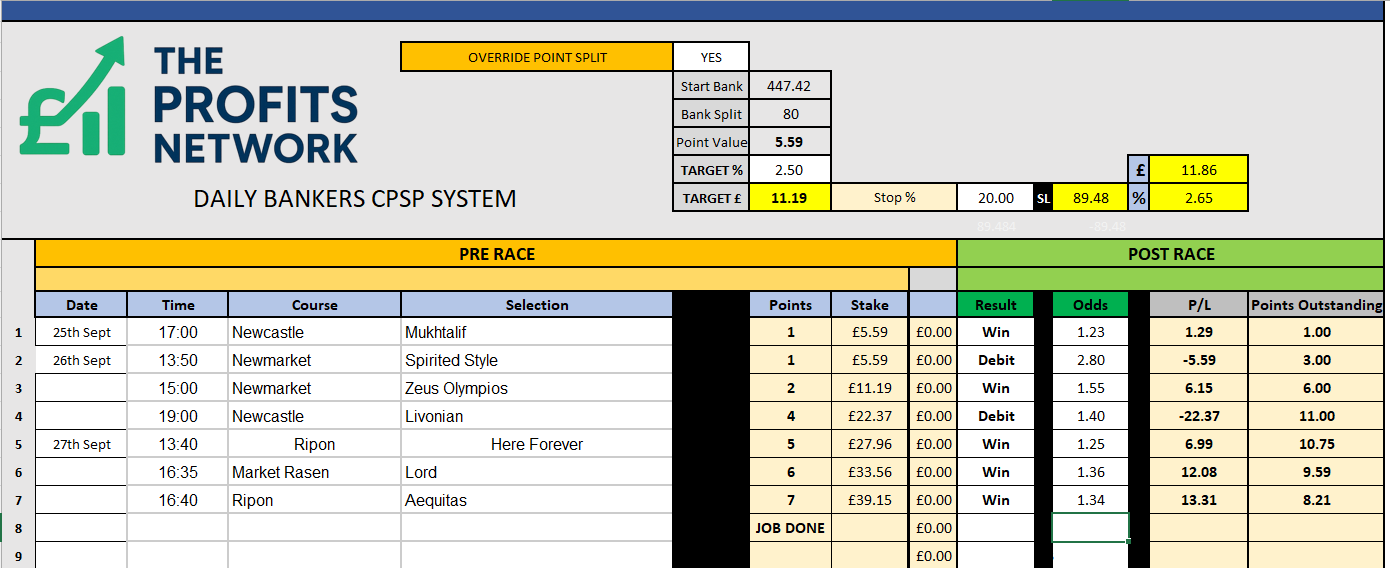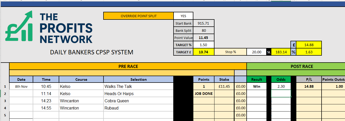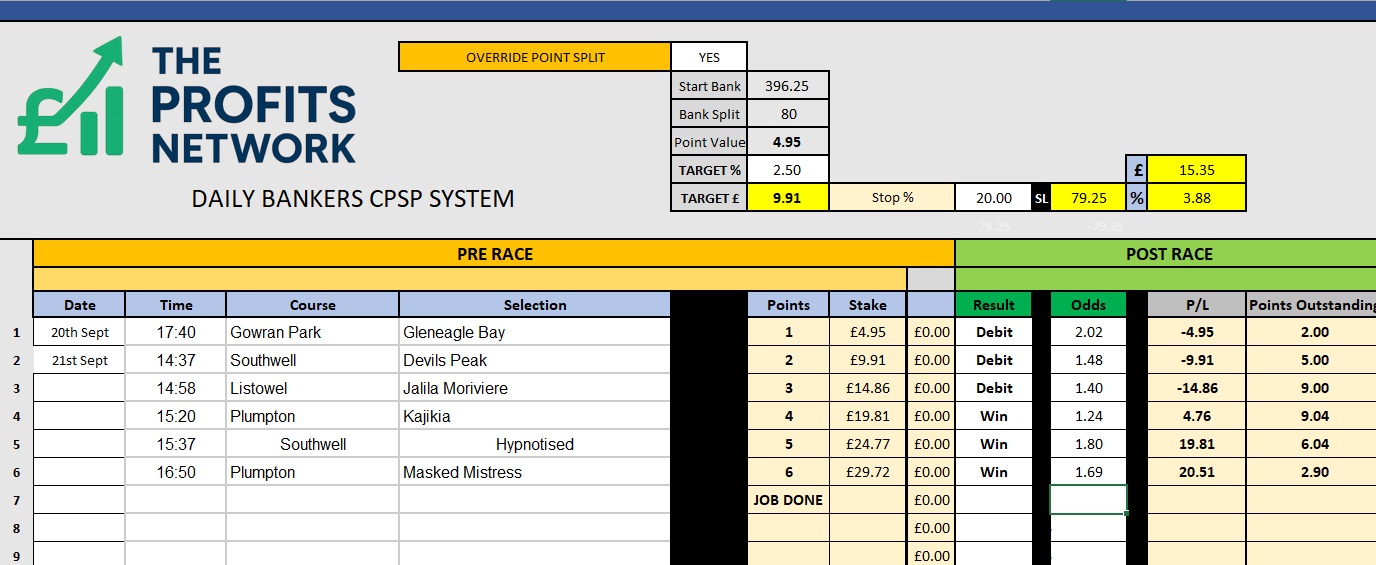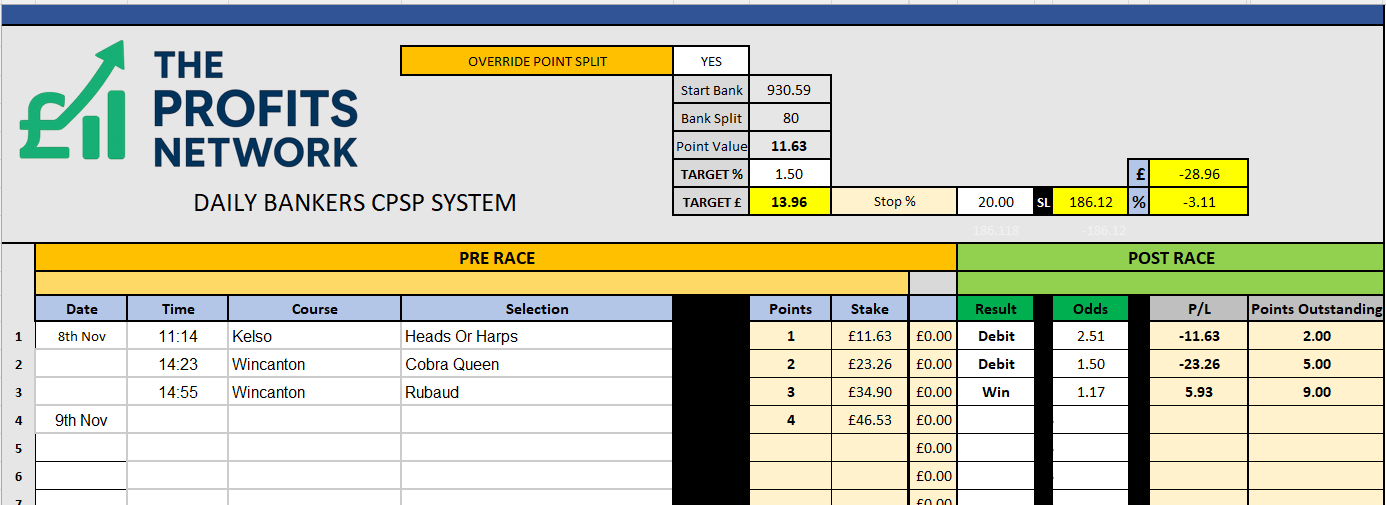 I didn’t work the 4th bet today as no 3tbp market available on Betdaq, with only 1.15 being needed for a target. Thought the 1.7 on 2tbp was too risky with the increased CPSP stake.