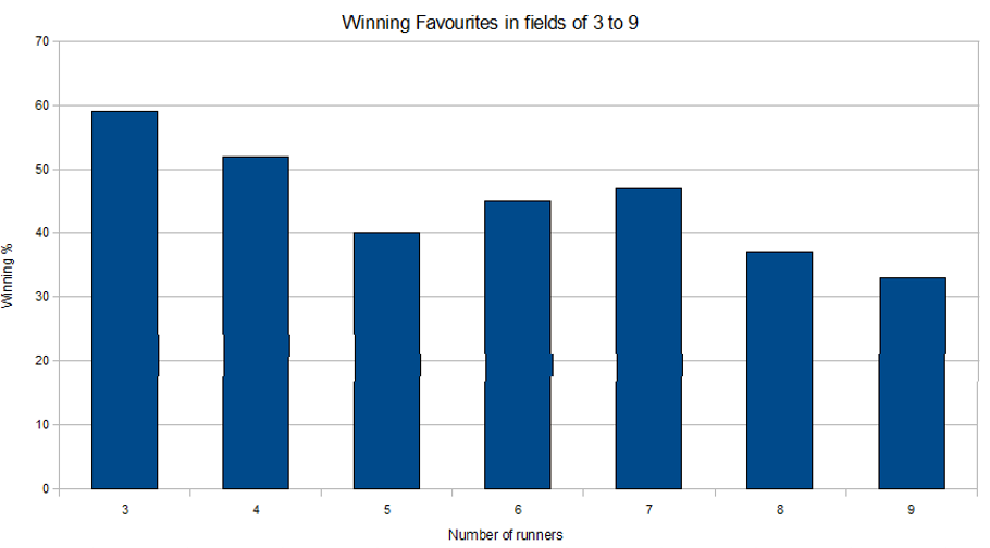 On average 43% of favourites win races with between 3 and 9 declared runners. Because of the extra certainty of winning (raw chance) the odds will be lower overall; and favourites will be returned from odds on to around 4.5 (7/2).