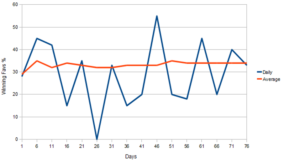 But by day 37 the running average has settled at 34% of favourites winning. It runs through at that level as a flat line to the 80th day.